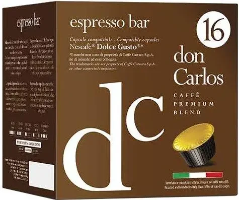 Кава в капсулах Dolce Gusto Don Carlos Espresso Bar - являє собою суміш арабіки та робусти, обсмажених до середнього ступеня. Це поєднання забезпечує багатий смак і глибокий аромат, характерні для італійського еспресо. Капсули Dolce Gusto Don Carlos Espresso Bar розроблені спеціально для використання в кавових машинах Dolce Gusto, що дає змогу легко і швидко приготувати еспресо в домашніх умовах. Вони забезпечують оптимальний тиск і температуру, щоб видавити всю глибину смаку й аромату кави.